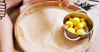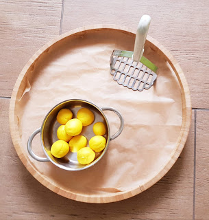 Ich habe ein großes Tablett mit Backpapier ausgelegt, darauf einen kleinen Topf gestellt, gelbe Knete (damit es aussieht wie Kartoffeln) zu Kugeln geformt und in den Topf gelegt. Ein Kartoffelstampfer dazu, fertig!