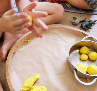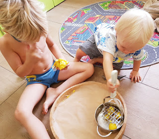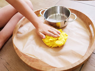 Hauptakteur ist die Knete. Mein großer Sternentänzer liebt Knete. Gleichzeitig findet er es toll, wenn er in der Küche helfen kann. Also habe ich Folgendes vorbereitet: